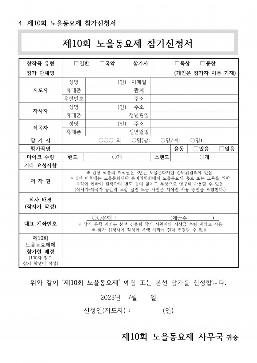 제10회 노을동요제-대회요강(2023년 5월 30일) 페이지 정보 작성자 최고관리자 작성일 23-05-30 09:51 조회 2,480회 본문 첨부파일 제10회 노을동요제-대회요강2023년 5월 30일.hwp (70.5K) 제10회 노을동요제-대회요강2023년 5월 30일.pdf (115.8K) <첨부파일을 내려받아 확인바랍니다>> 이전글공지사항-2023-제1호-제10회 노을동요제 본선 진출자 공지사항(2023.07.25) 23.07.25 다음글공지사항-2022-제9회 노을동요제 수상 팀 결과 공지 22.11.28 목록