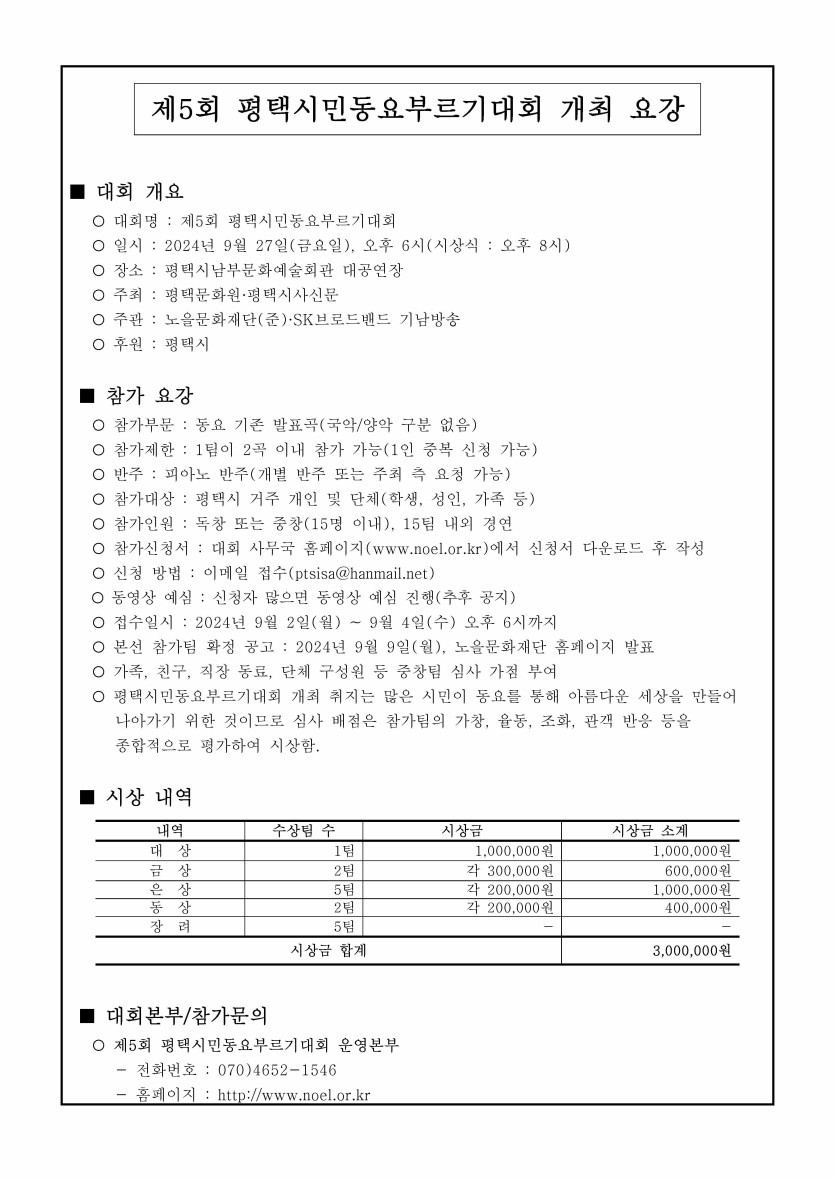 홈페이지게재-제5회 평택시민동요부르기대회-개최 요강(2024년 9월 27일) 페이지 정보 작성자 최고관리자 작성일 24-07-25 10:06 조회 1,487회 본문 첨부파일 홈페이지게재-제5회 평택시민동요부르기대회-개최 요강2024년 9월 27일.hwp (134.5K) 홈페이지게재-제5회 평택시민동요부르기대회-개최 요강2024년 9월 27일.pdf (94.5K) 이전글공지사항-2024-제1호-제5회 평택시민동요부르기대회 본선 진출자 공지사항(2024.09.12) 24.09.12 다음글공지사항-2024-제2호-제11회 노을동요제 본선 진출자 공지사항(2024.07.24) 24.07.24 목록